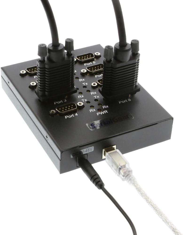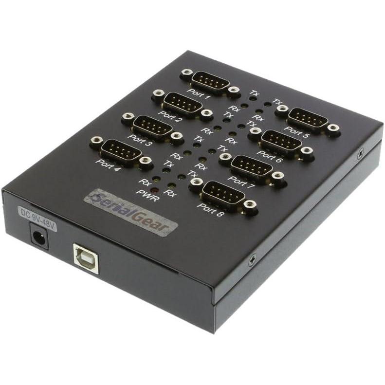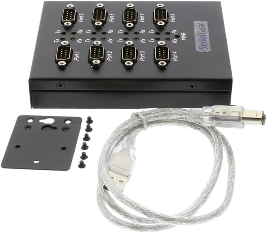 RS-232 | 128 Bytes Receive | 384 Bytes Transmit Superior Build Quality: Housed in a rugged steel chassis with built in mountable flanges, the serial adapter hub is perfect for installations in labs, warehouses, or heavy machinery. Safe Industrial Connections: Designed for use with Bar Code Scanners, Time Clocks, Label Printers, Point of Sale Terminals, Receipt Printers, and more the USB to Serial Adapter offers 15kV surge protection for connected devices. Expand Your Serial Capabilities: Connect 8 legacy 9-pin serial device through a USB-A port to add legacy functionality to newer technologies with no serial port connections. COM Retention: COM Ports are fully configurable, and after reboots, port assignments are preserved. USB Power: Power is drawn from a USB connection, no bulky power supply or power outlet is required. Upstream: 1 USB port, Type B Female Connector Downstream: 8 Male DB9, w/ nuts LEDs: Power, TX / RX Description Introduction: Our new industrial USB to 8-Port RS-232 Serial Adapter gives your laptop or workstation the ability to communicate between a USB (Universal Serial Bus) port and up to eight RS-232 serial Ports. The USB2-8COM-M USB Octal (8 Port) Serial Adapter is designed to take advantage of your host USB port to expand your native serial COM capabilities. The USB 2.0 to 8-Port RS-232 serial adapter instantly adds eight RS-232 serial communication ports to your system from its industry-grade construction chassis by taking advantage of the USB bus. Plugging the Industrial 8-Port Serial Adapter to the USB port, the adapter is automatically detected and installed with no need for configuration on your part. There are no IRQ & COM port conflicts, since the ports do not require any additional IRQ, DMA, memory as resources on the system. The USB 2.0 Octal Serial Adapter is provided with a switching power adapter. The USB 2.0 Octal Serial Adapter provides instant connectivity with modems, ISDN TAs, PDAs, handheld & pocket PCs, digital cameras, POS, serial printers. It is suitable for remote access, retail and industrial applications, data collection and other applications requiring high speed RS-232 serial communication ports. Features: Adds eight industrial RS-232 serial ports by connecting to a USB port Installed as standard Windows COM port SECC metal chassis with DIN rail bracket Full RS-232 modem control signals and hardware/software flow control RS-232 data signals: TxD, RxD, RTS, CTS, DSR, DTR, DCD, RI, GND High speed serial port with the baud rate up to 921.6K bps 128 byte transmit FIFO & 384 byte receive FIFO Non-standard baudrates supported LEDs of Power, TxD and RxD for easy port monitoring and diagnostics Serial port protected with surge protection of 10KV Self-powered. One switching power adapter of 12V, 1A provided. Easy plug and play installation and RS-232 device connection COM port number assigned can be changed to any COM port number required Works with USB 1.1 & 2.0 host port OS Support: Windows Windows 7, Windows 8, Windows 10, Windows 11 Linux and Mac OS 10.X Package Contents: 8-port USB 2.0 to RS-232 serial adapter Din Rail mounting plates and screws USB A to B cable *Surface Mounting screws not included. Specifications Product Specifications Environmental Operating Temperature 0C to 55C Performance Isolated/Surge Protected Yes Hardware Chipset FTDI LED Indicators Power, TX / RX Product Information Warranty 1 year from date of purchase Software OS Support Win 11, Linux, Mac OSX, Win 10, Win 7, Win 8 Serial Attributes RS Signals TxD, RxD, RTS, CTS, DSR, DTR, DCD, RI, GND Serial Standards RS232 Baud Rate 921.6K bps FIFO Receive 128 bytes FIFO Transmit 384 bytes Data Bits 7, 8 Parity None, Even, Odd, Mark, Space Stop Bits 1, 2 Flow Control Hardware (RTS, CTS), XON/XOFF USB USB Type USB 2.0 Isolated/Surge Protected Yes Screw Lock Compatible Yes Mechanical Color Black Item Dimensions (L × W × H) 4.80 × 5.11 × 0.98 in. Item Weight 0.881 lbs. Mounting Style Din-Rail (Optional Bracket) Ports 8 Serial Ports Material of Construction Steel Compliance Country of Origin Taiwan Compliance RoHS, TAA Other Data Connector DB9 Male w/ Nuts Chip Model FT4232HL, GL852G, SP3243EUEA Weight 1.75 lbs Dimensions 11.25 × 5.75 × 2.5 in UPC: 729440690793