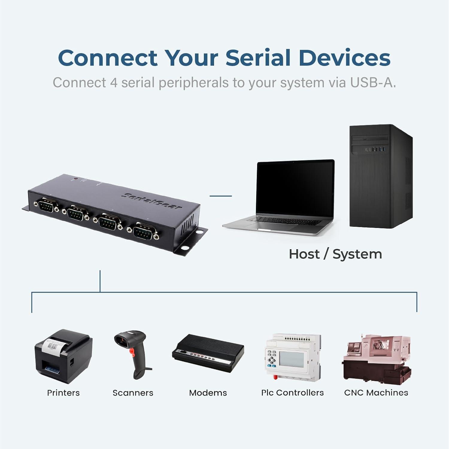 USBG-BAY4 is a 4 port DB9 RS232 to USB serial adapter that is designed for PC, thin client, or server to provide instant COM port expansion via the Universal Serial Bus (USB)